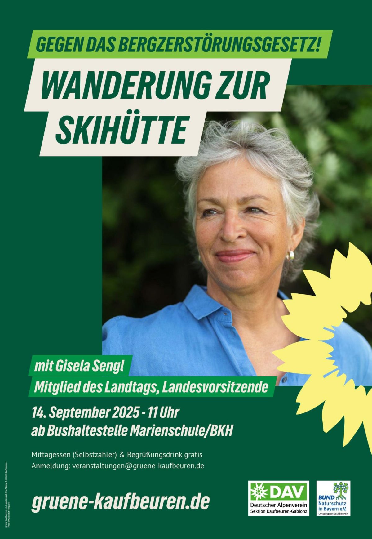 Am Sonntag, den 14. September 2025, machte sich eine bunt gemischte Gruppe aus Naturfreund*innen, Politik-Interessierten und Mitgliedern von Umweltverbänden auf den Weg zur Skihütte oberhalb von Kaufbeuren. Eingeladen hatten der Stadtverband Kaufbeuren von Bündnis 90/Die Grünen, die DAV-Sektion Kaufbeuren-Gablonz sowie die BUND-Naturschutz-Ortsgruppe Kaufbeuren. Bei meist strahlendem Herbstwetter ging es nicht nur um Bewegung an der frischen Luft, sondern auch um ein Thema, das vielen Teilnehmenden am Herzen liegt: der geplante Abbau der Umweltverträglichkeitsprüfung im Alpenraum – von Kritikern bereits als „Bergzerstörungsgesetz“ bezeichnet.