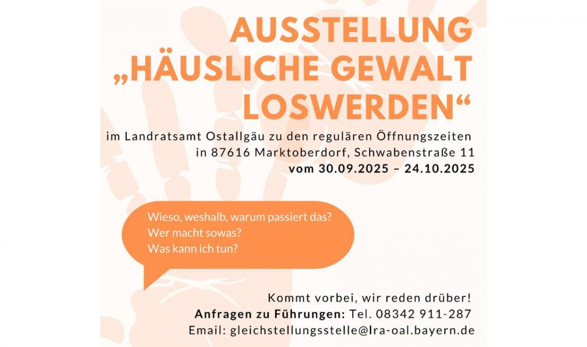 Anlässlich des 30-jährigen Bestehens des Frauenhauses Kaufbeuren/Ostallgäu und in zeitlicher Nähe zum Gedenktag gegen Gewalt an Frauen am 25. November haben die Gleichstellungsstellen der Stadt Kaufbeuren und des Landkreises Ostallgäu die Wanderausstellung „Häusliche Gewalt LOSwerden“ ins Landratsamt nach Marktoberdorf geholt. Dort ist sie vom 30. September bis 24. Oktober zu den regulären Öffnungszeiten zu sehen – die öffentliche Vernissage findet am 2. Oktober statt.