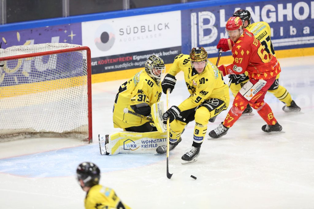 Die Joker zeigten vor allem zu Beginn ein gutes Drittel und schafften es, den Tabellenführer das eine oder andere Mal in deren Zone festzusetzen, wodurch sie zu guten Chancen kamen. Die Krefelder ihrerseits waren vor allem mit ihrer Paradereihe brandgefährlich. Die Allgäuer schafften es jedoch, die Krefelder vor dem eigenen Tor fernzuhalten, auch wenn diese viel Wirbel in der Kaufbeurer Defensivzone sorgten. Zudem konnte sich Cody Porter mit der einen oder anderen starken Parade auszeichnen. Die Krefelder sollten dann aber doch noch in Führung gehen. Dabei nutzten sie ein Powerplay in der 16. Spielminute zum 0:1. Die Joker verteidigten in Unterzahl zunächst wirklich gut, doch kurz vor Ablauf der Strafe traf Jan Nijenhuis nach einem perfekten Zuspiel von Roope Mäkitalo doch noch für den KEV. Zu allem Überfluss kassierten die Joker in Person von Rio Kaiser 18 Sekunden vor der Pausensirene noch eine weitere Strafe und hatten dabei sogar Glück, dass die Hauptschiedsrichter, die auch den Videobeweis zu Rate zogen, bei einer kleinen Strafe blieben. Trotz alledem ging es für den ESVK also in Unterzahl in das Mitteldrittel. Etwas kurios dabei ist vielleicht, dass die Joker in Unterzahl, Sekunden vor der Pausensirene, sogar noch eine große Chance auf den Ausgleichstreffer vergeben hatten.