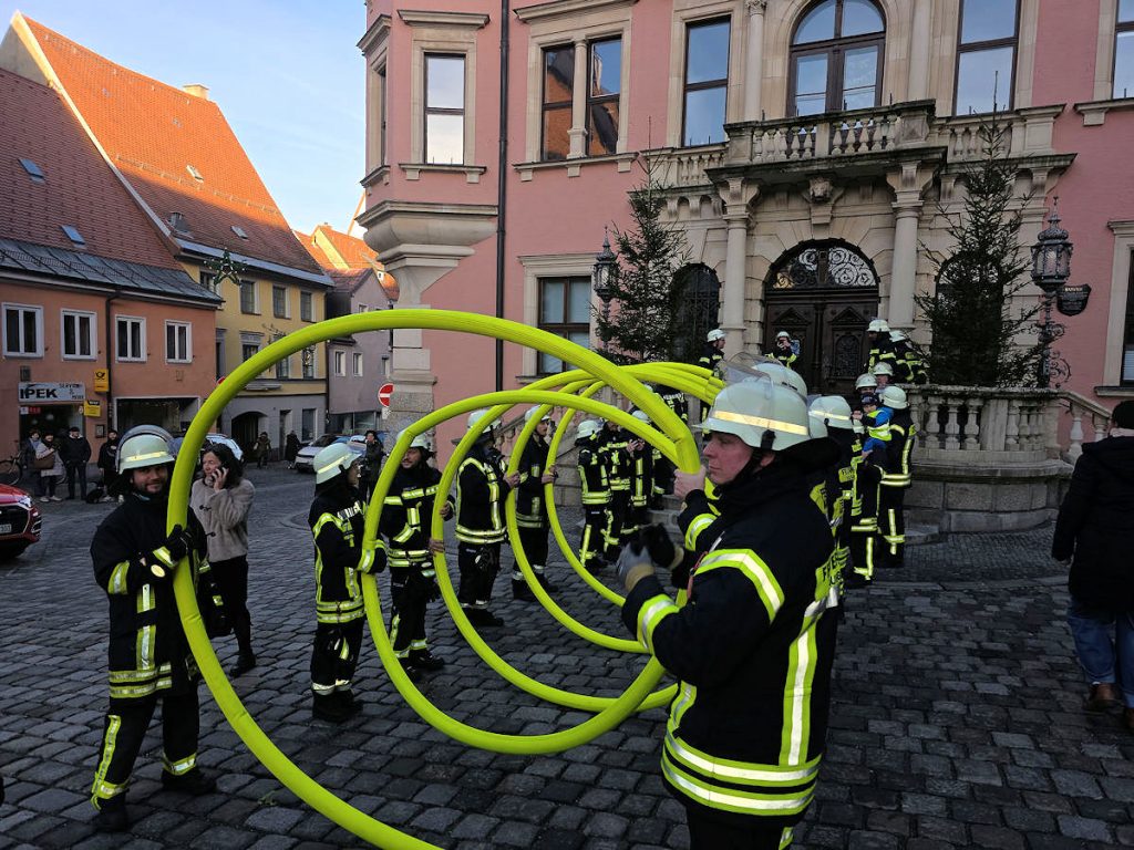 Ein besonderes Highlight bereitete die Feuerwehr Kaufbeuren: Sie war mit mehreren Fahrzeugen vor Ort und hatte einen Spalier aus Feuerwehrschläuchen aufgebaut, durch den das Brautpaar schreiten durfte.
