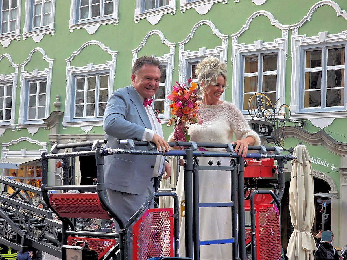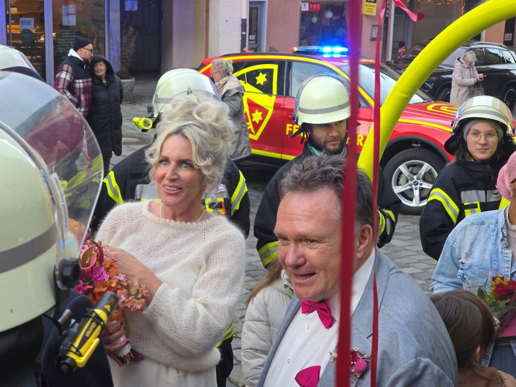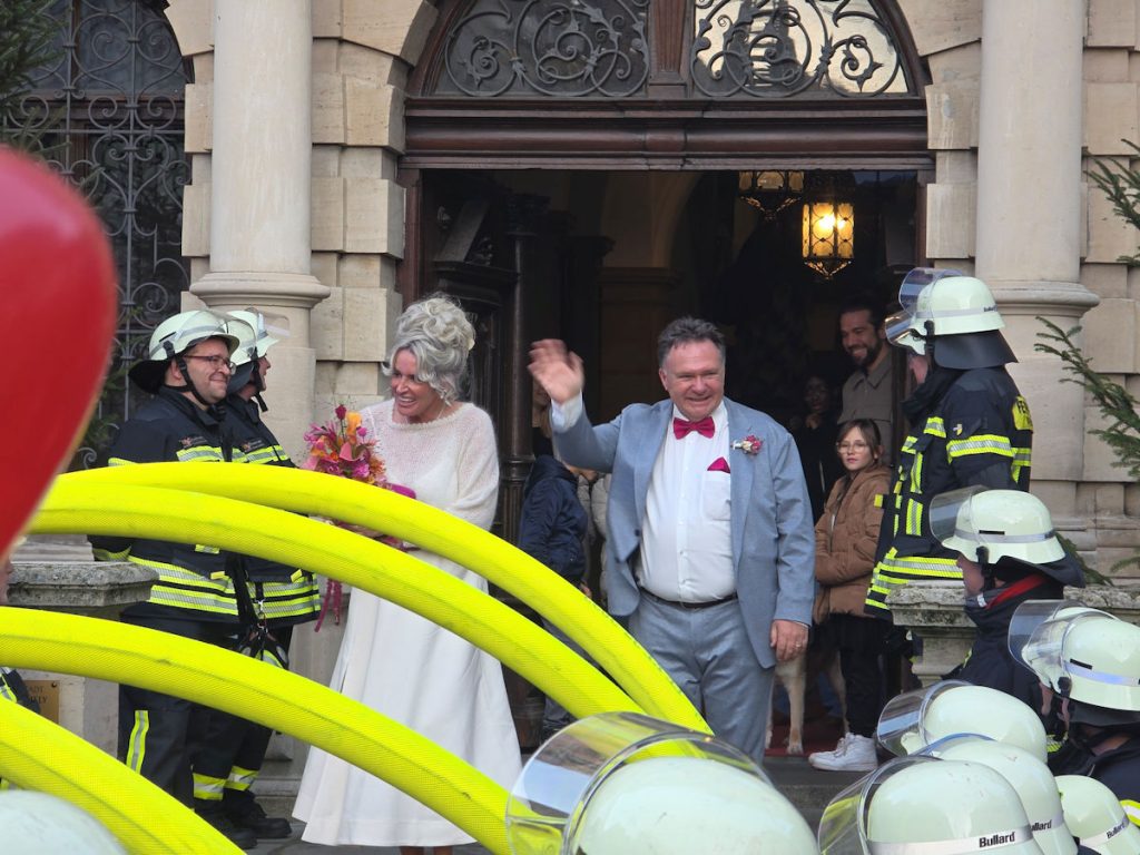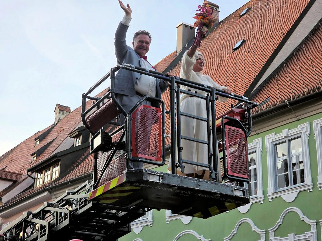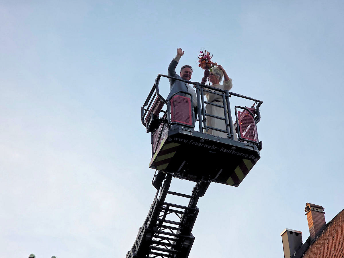 Im Anschluss an die Zeremonie sorgte die Feuerwehr für einen weiteren symbolischen Moment. Mit der Drehleiter wurde das Paar im Korb des Fahrzeugs rund 30 Meter in die Höhe gefahren – ein Zeichen, das sinnbildlich für den besonderen Tag stehen dürfte.
