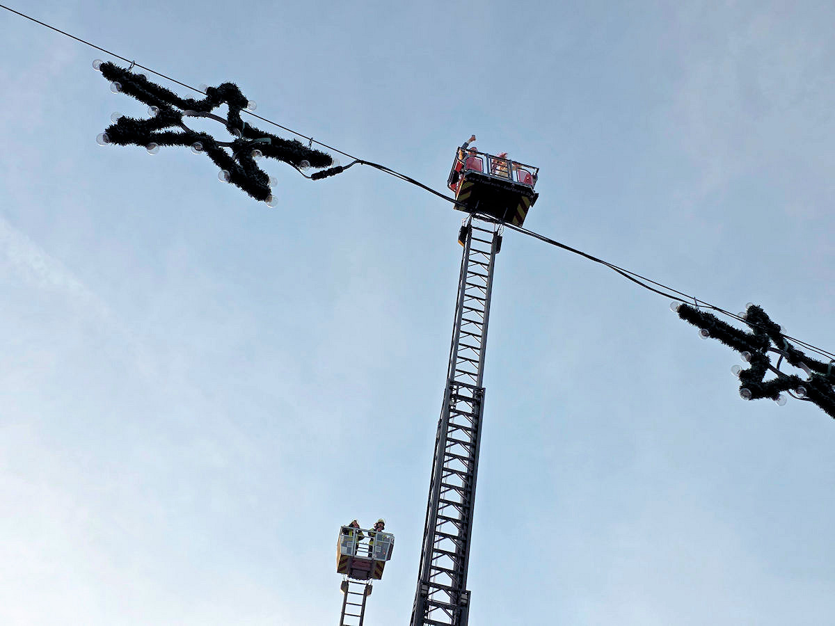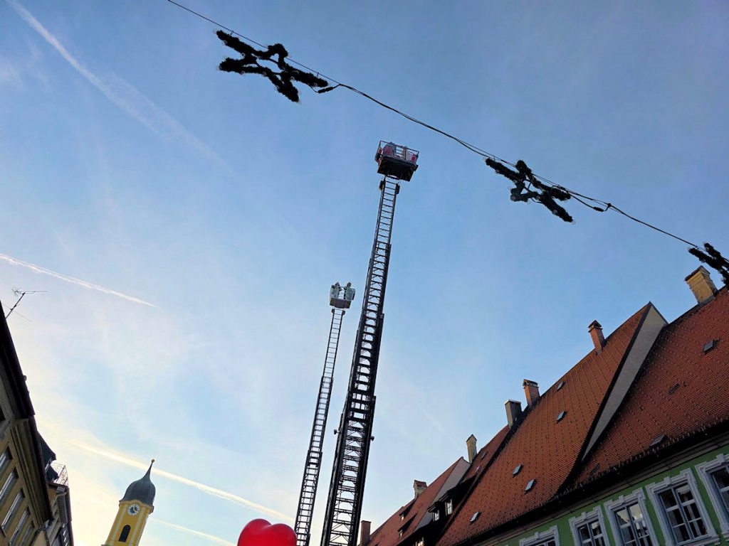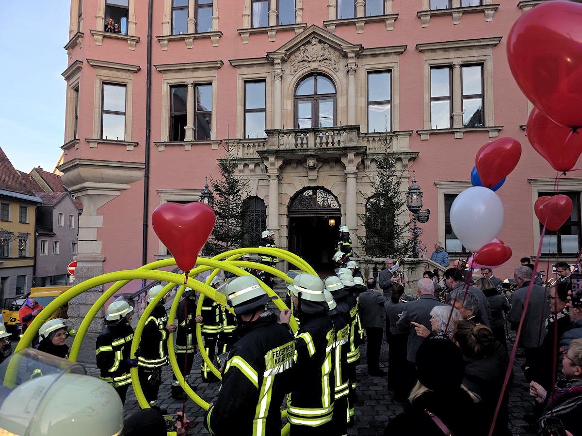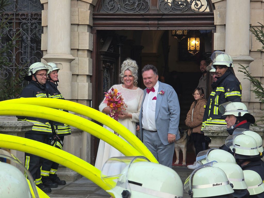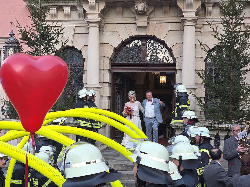 Im Anschluss an die Zeremonie sorgte die Feuerwehr für einen weiteren symbolischen Moment. Mit der Drehleiter wurde das Paar im Korb des Fahrzeugs rund 30 Meter in die Höhe gefahren – ein Zeichen, das sinnbildlich für den besonderen Tag stehen dürfte.