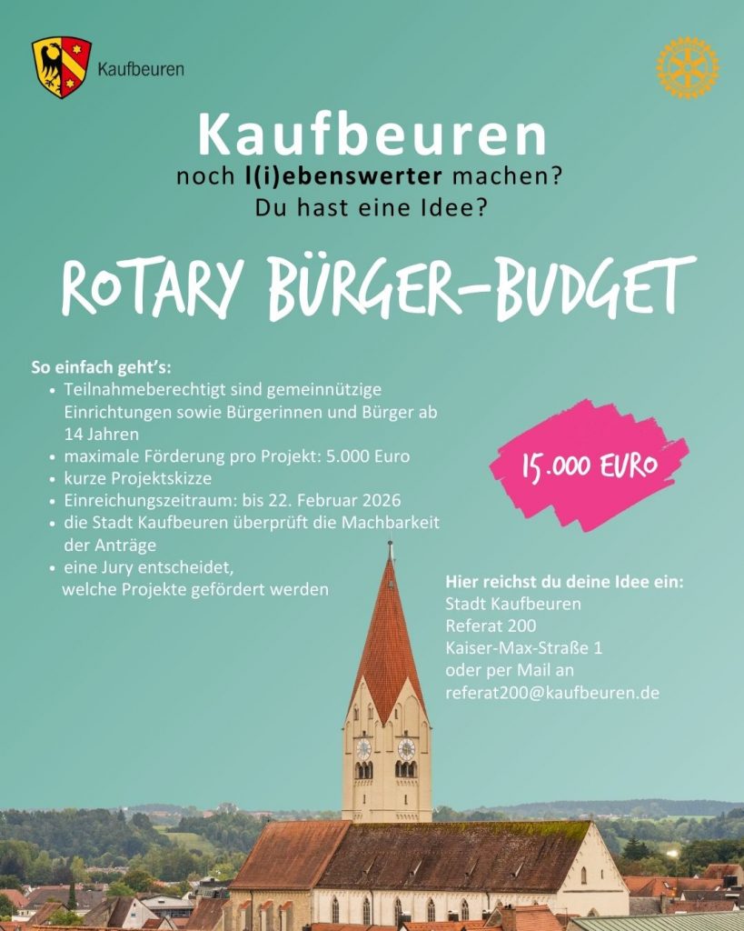 Mit dem neuen Bürgerbudget „L(i)ebenswertes Kaufbeuren“ laden der Rotary Club Kaufbeuren und die Stadt Kaufbeuren alle Bürgerinnen und Bürger ein, eigene Ideen einzubringen, die unsere Stadt im Jahr 2026 noch attraktiver, lebenswerter und liebenswerter machen. Bis zum 22. Februar 2026 können Projektideen eingereicht werden, die das Zusammenleben in Kaufbeuren verbessern, das Gemeinwohl fördern und sichtbar zur Verschönerung oder Belebung unserer Stadt beitragen. Die besten Ideen werden bis spätestens April 2026 durch eine unabhängige Jury ausgewählt und veröffentlicht.