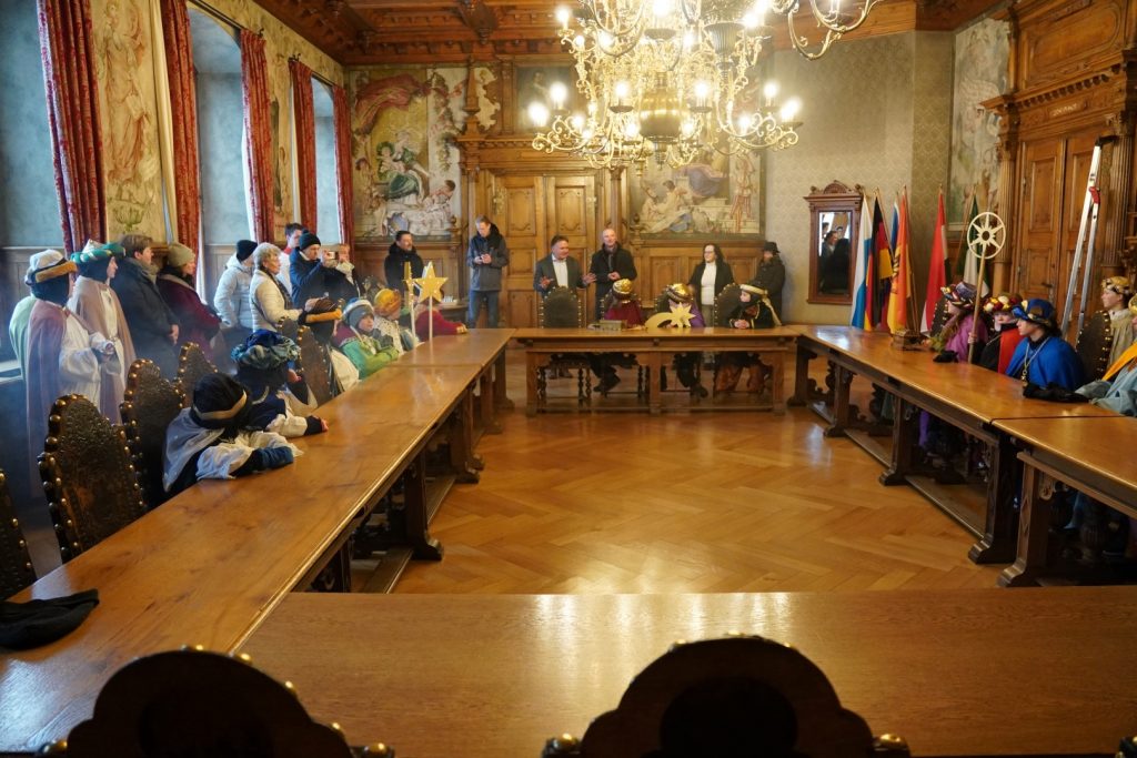 Es ist Tradition, dass die Sternsinger der Pfarreiengemeinschaft Kaufbeuren im Rathaus kurz nach Neujahr zusammenkommen, um hier ihren Segen zu verkünden. Nach ihrem Aussendungsgottesdienst wurden sie von Oberbürgermeister Stefan Bosse im historischen Sitzungssaal des Rathauses empfangen. In diesem Jahr lautet das Motto „Schule statt Fabrik – Sternsinger gegen Kinderarbeit“ und kommt verschiedenen Projekten auf der gesamten Welt zugute.
