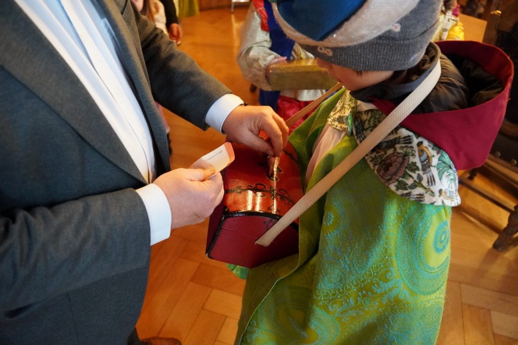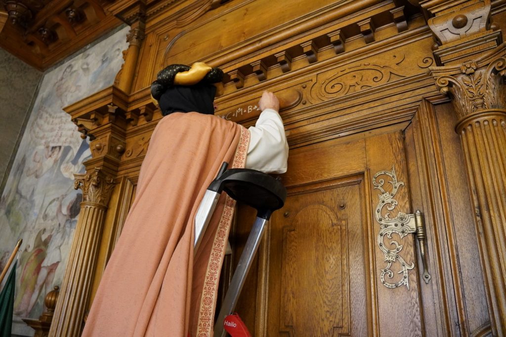 Nach dem Singen mehrerer Lieder und dem Vortragen ihrer Verse, wurde auch das Rathaus durch die Sternsinger an der Tür des historischen Sitzungssaals gesegnet. Abschließend erhielten sie noch eine Gabe durch den Oberbürgermeister.