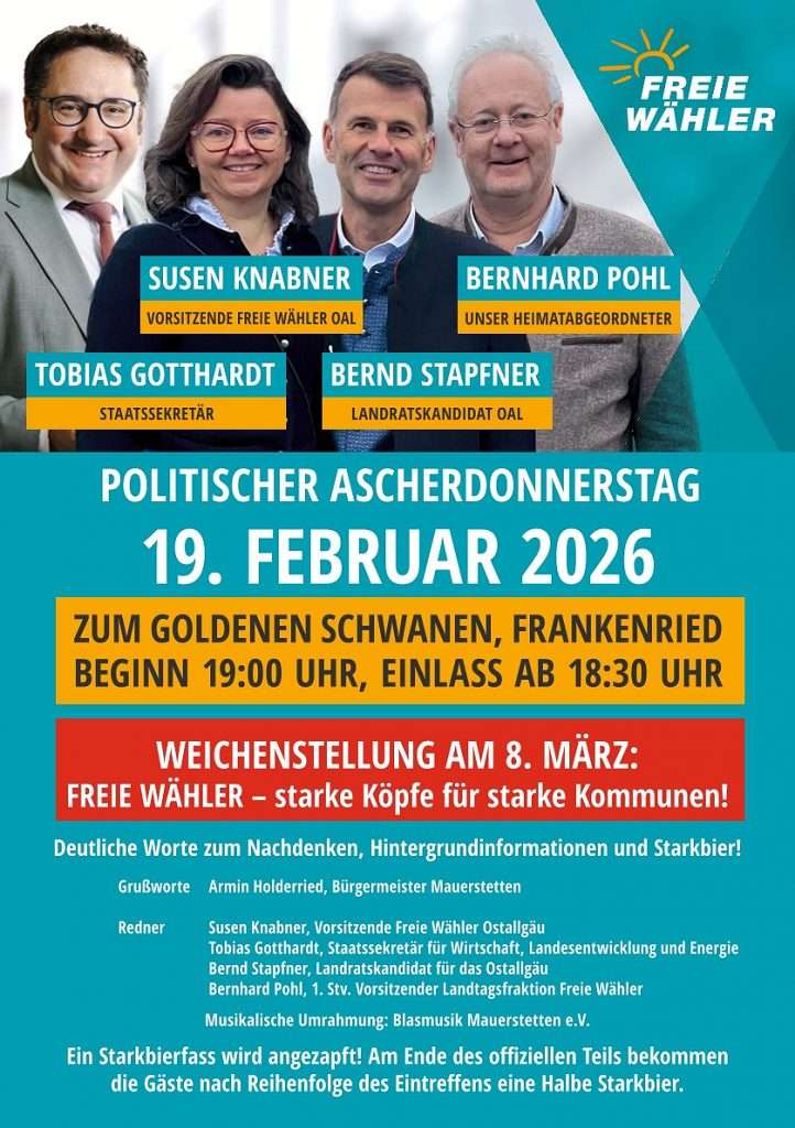 Die FREIEN WÄHLER Kaufbeuren laden zum diesjährigen Ascherdonnerstag am 19. Februar um 19 Uhr in das Gasthaus zum Goldenen Schwanen in Frankenried ein. Die Veranstaltung verbindet politische Reden mit traditioneller Wirtshausatmosphäre.