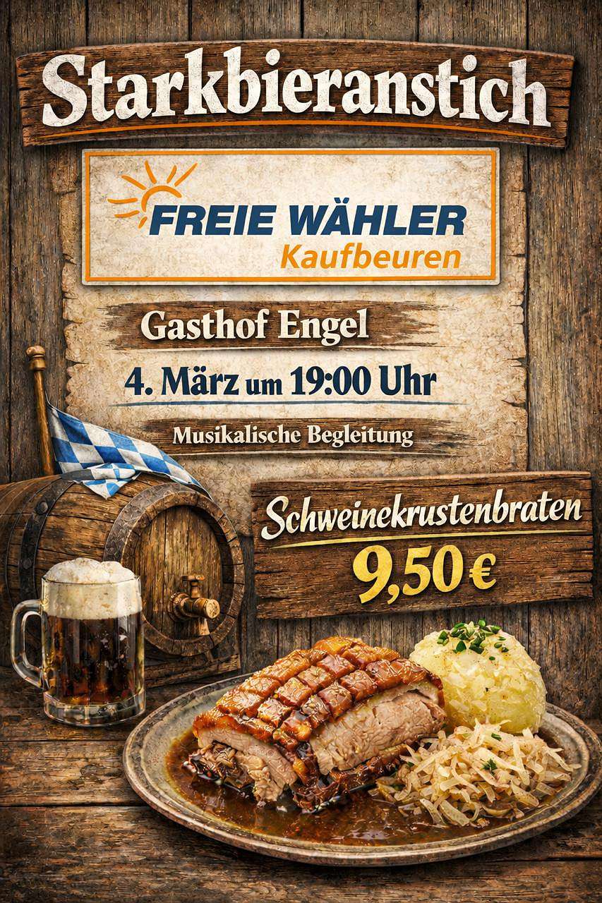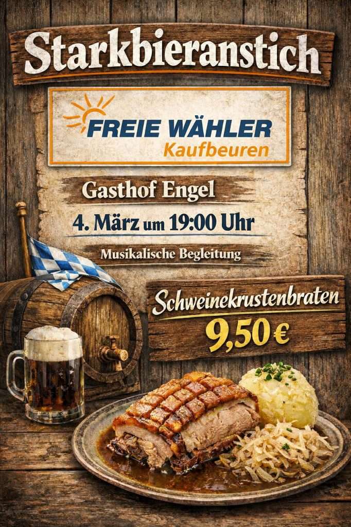 Darüber hinaus laden die FREIEN WÄHLER Kaufbeuren am 4. März um 19 Uhr zum Starkbieranstich in den Gasthof Engel in Oberbeuren ein. Auch hier soll neben dem geselligen Teil der Austausch im Mittelpunkt stehen.