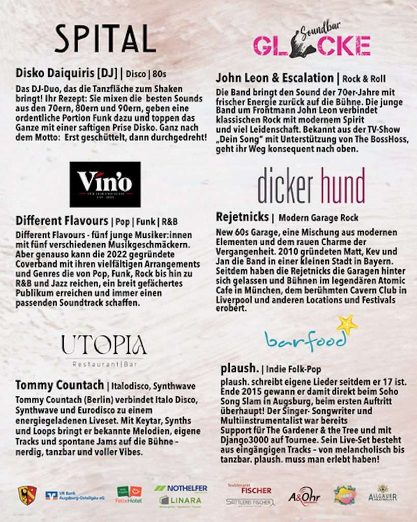 Mit dabei sind unter anderem Acts wie Ryan Inglis (Acoustic Indie-Pop), John Leon & Escalation (Rock), Salon Bitter (Electro-Pop) sowie zahlreiche DJs mit House, Mashups und Party Classics.